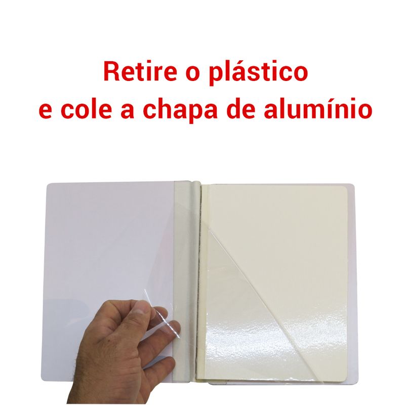 Após as folhas de alumínio serem sublimadas, elas são fixadas nas páginas do álbum. Para fixar as folhas de alumínio, remova o plástico das páginas e pressione suavemente para garantir a aderência.
