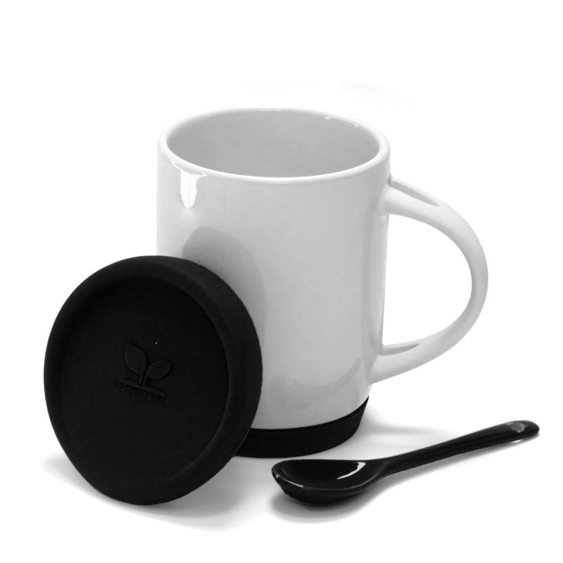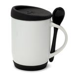 Caneca para Sublimação de Cerâmica Branca com Colher, Alça Soft e Tampa Base em Silicone - Preta