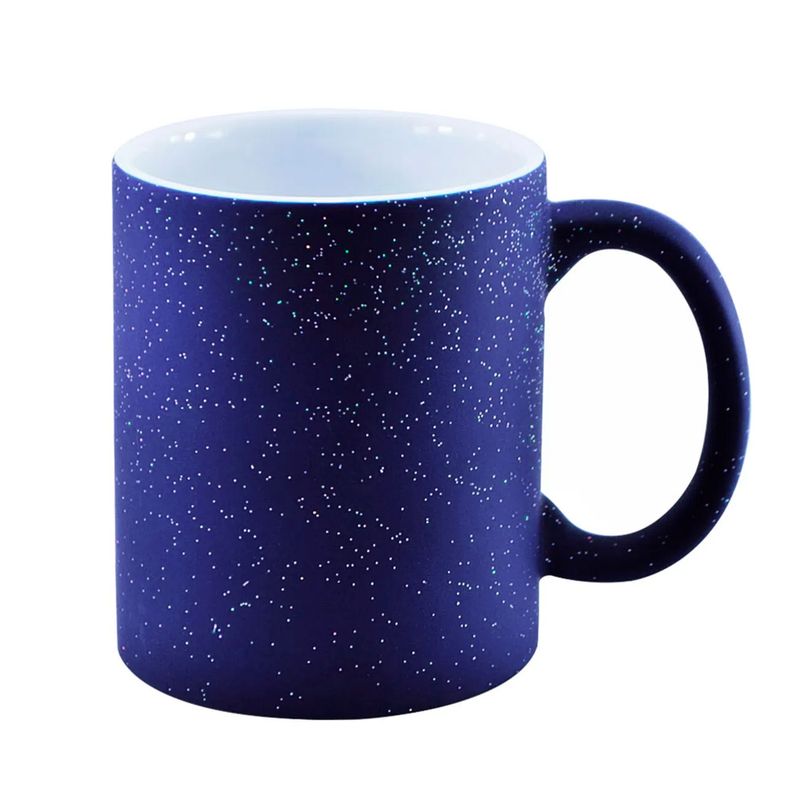 A impressão é feita na superfície azul, e parece invisível, mas a imagem irá se revelar quando adicionado um liquido quente dentro dela! Pode ser qualquer tipo de bebida quente, a imagem aparecerá feito mágica! E com um toque especial, pois ela tem Glitter!