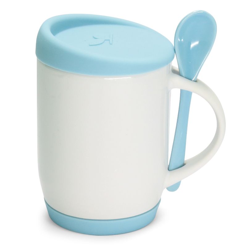 Caneca para Sublimação de Cerâmica Branca com Colher, Alça Soft e Tampa Base em Silicone - Azul Bebê