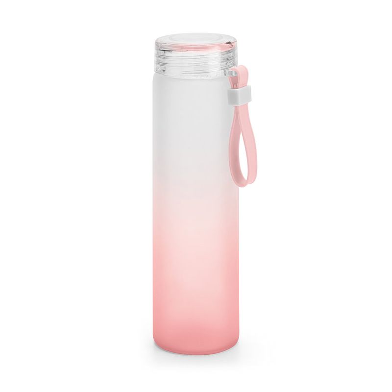 A garrafa é feita de vidro jateado com capacidade de 450ml, acompanha fita de silicone para evitar que caia no chão durante o transporte e uma tampa de acrílico resistente que mantém a bebida fresca por mais tempo