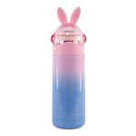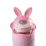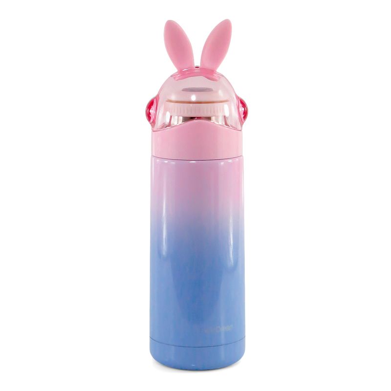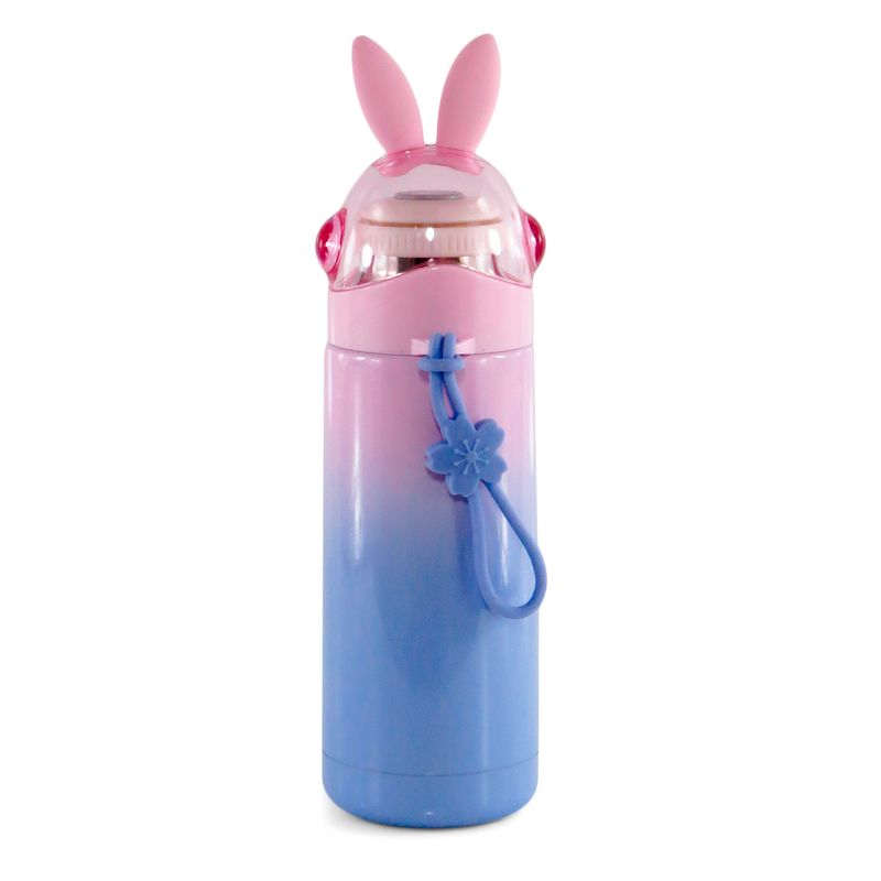 Para manter-se hidratado é mais prático ter sempre por perto uma garrafa, se ela for personalizada, fica muito melhor. Esta garrafa de aço inoxidável é muito mais resistente, pois tem parede dupla e mantém o líquido fresquinho, tem design ousado, na cor rosa com tampa de coelhinho.