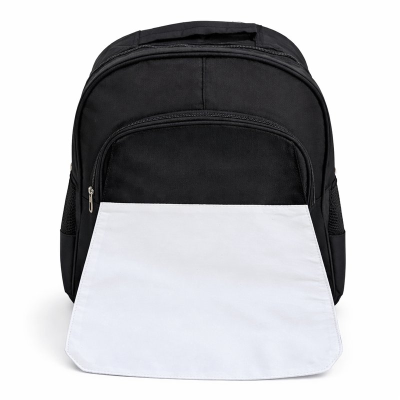 Produzida em tecido poliéster resistente, possui área frontal branca própria para sublimação, garantindo cores vibrantes, excelente definição e durabilidade da estampa. O restante da mochila em preto traz um visual mais neutro e versátil, atendendo diferentes públicos e estilos.