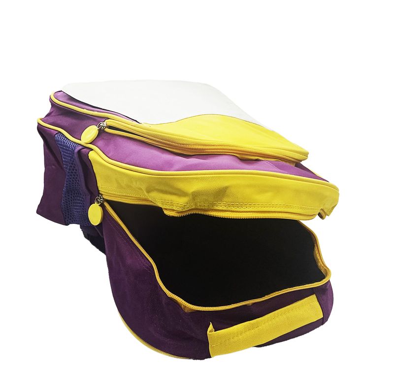 A Mochila Infantil Grande para Sublimação (41x30cm) – Roxa/Amarelo é perfeita para quem deseja personalizar com criatividade e oferecer um item útil, confortável e visualmente encantador. Possui painel frontal em tecido poliéster sublimável, ideal para aplicar estampas com nomes, personagens, logos escolares, ilustrações ou artes exclusivas com alta definição e fidelidade de cores.