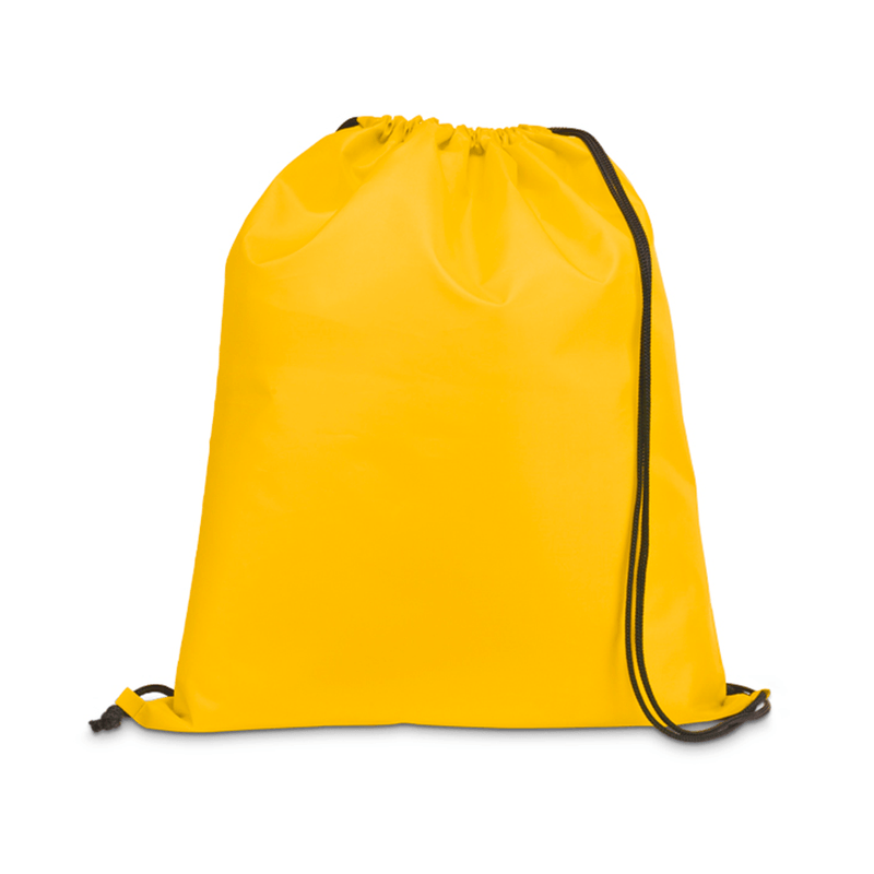 Seu corpo é feito em nylon amarelo resistente, com fechamento por cordões laterais que também funcionam como alças de ombro, tornando a peça fácil de transportar e dobrar. É muito utilizada como brinde promocional, lembrancinha infantil, item escolar, eventos, academias e ações publicitárias personalizadas.