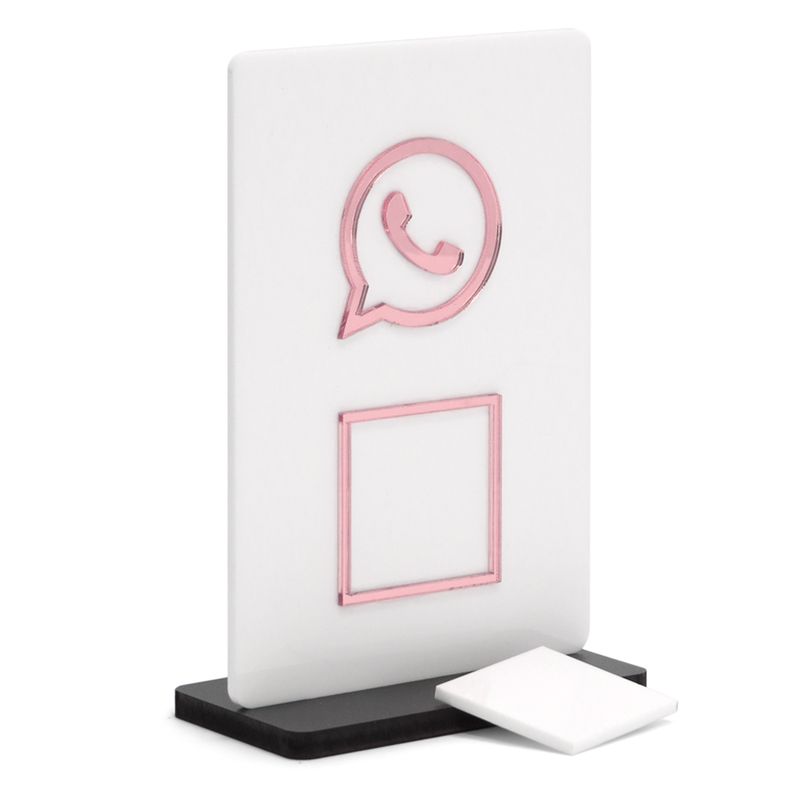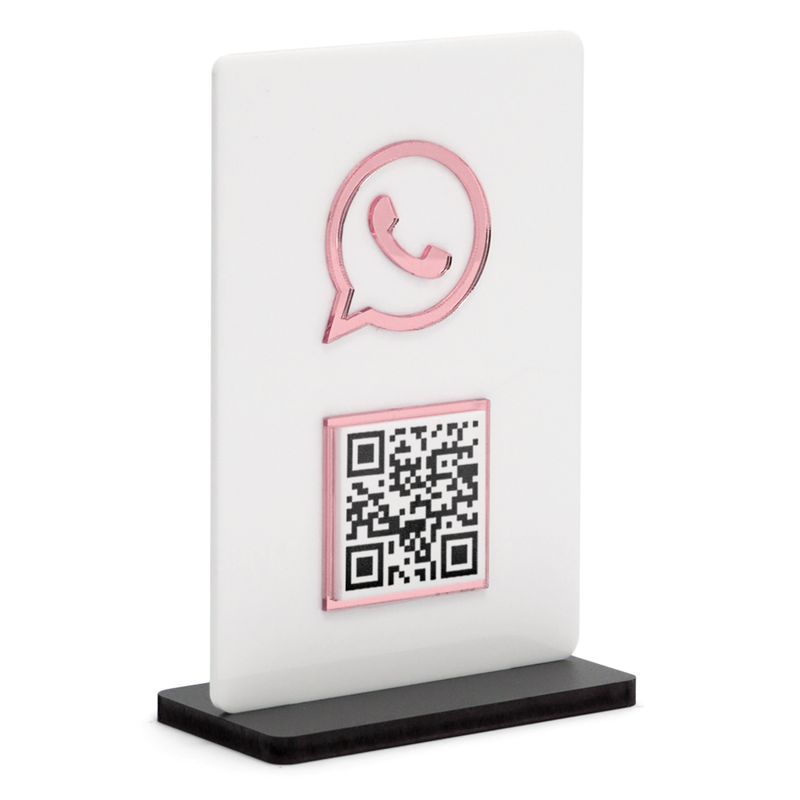 Placa de Acrílico Branca QR CODE Rose WhatsApp - 10x15cm com Base de MDF Preto 6mm é a solução ideal para estabelecimentos, eventos e profissionais que desejam facilitar a comunicação com clientes.