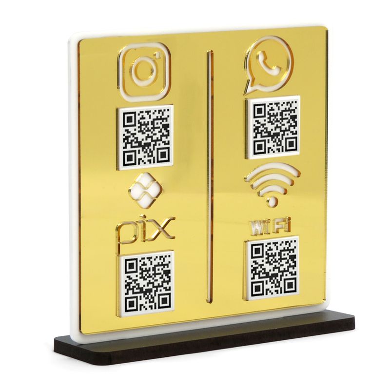 O destaque deste modelo são as 4 pequenas plaquinhas fixadas sobre a estrutura principal, todas com superfície branca para sublimação, ideais para aplicação de QR Codes personalizados que direcionam para redes sociais, cardápios digitais, WhatsApp, sites ou links de pagamento.