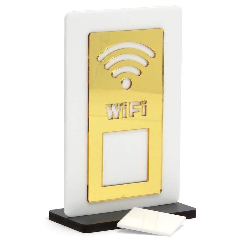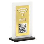 Placa de Acrílico QR CODE Dourado Wifi 10x15cm com Base de MDF Preto 6mmDescrição Essa placa de acrílico dourada com QR Code para Wifi é um charme para facilitar a vida! Com 10x15cm, ela tem um visual sofisticado e vem com base de MDF preto 6mm que dá firmeza e estilo.