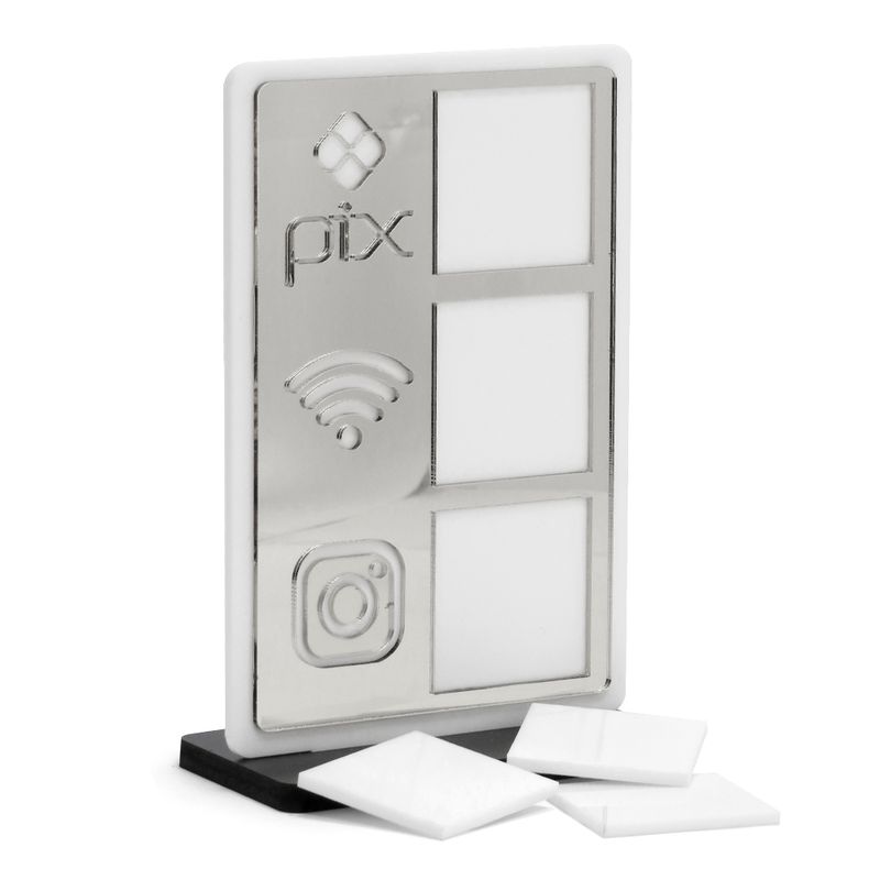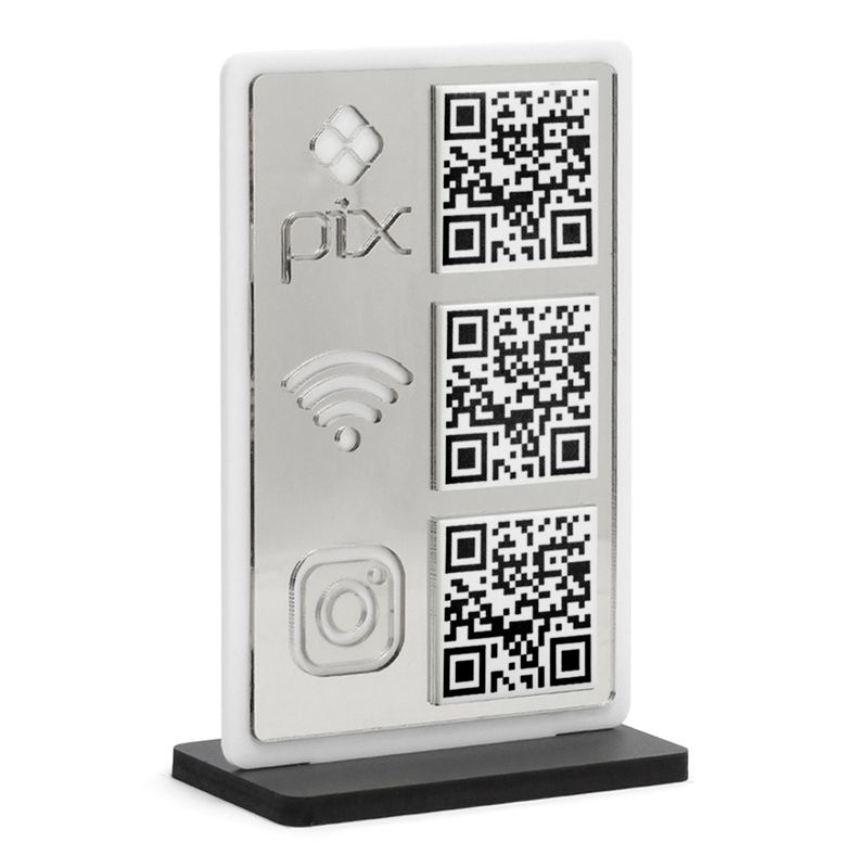 DescriçãoEssa placa de acrílico prata com QR Code é puro estilo e praticidade! Com 10x15cm, ela vem com uma base de MDF preto 6mm que dá aquele suporte firme e um visual elegante para qualquer lugar.