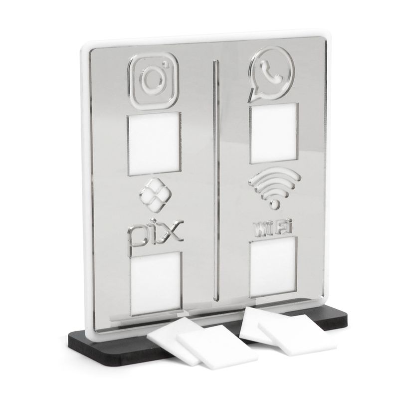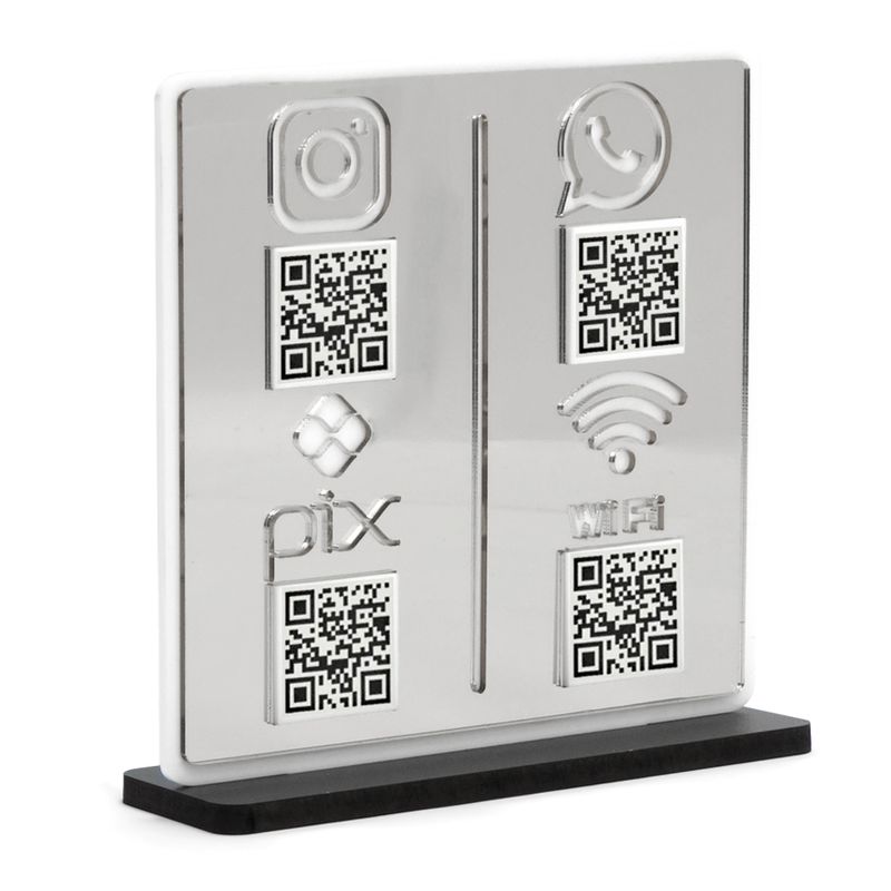 O destaque deste modelo são as 4 pequenas plaquinhas fixadas sobre a estrutura principal, todas com superfície branca para sublimação, ideais para aplicação de QR Codes personalizados que direcionam para redes sociais, cardápios digitais, WhatsApp, sites ou links de pagamento.
